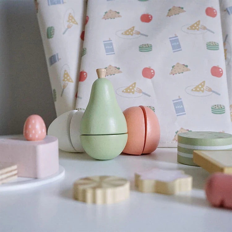 Let’s try having fun with food they’re usually picky about. Make food shapes and colors more familiar through play, and they just might try that pear they called ‘yucky’ all this time. This type of play is also great for setting up a meal routine.